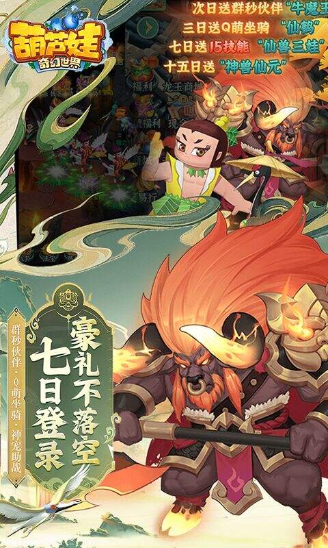 重温童年经典,《葫芦娃·奇幻世界》带你开启奇幻冒险!这是一款传统mmo回合制的2d手游。游戏剧情为葫芦娃七子降妖背景;功能在回合制核心功能上进行减法优化和微创新,主打宠物指定技能打书(宠物全红技能组合任意打),游戏节奏更快更简单,解放你的双手和时间。熟悉的七兄弟——大娃、二娃、三娃……每位葫芦娃都拥有独特神力,与你并肩对抗蛇精、蝎子精,守护人间!带你探索迷镜宫、妖窟、神山冲等经典场景!每日登录送万元现金券,解锁稀有装备,零氪畅玩顶级玩法!立即下载,与葫芦兄弟重温经典,开启守护人间的奇幻征程!
