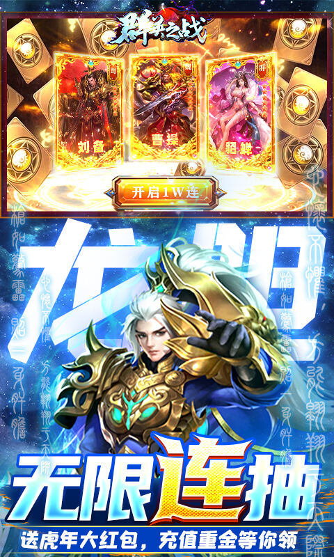 2.登陆送虎年大红包,自选势力阵容礼包,VIP直升V20,活动页面最高可领取2022元赠礼,持续登陆送充值,送连抽,满V满英雄再也不是梦。记得去“登陆送充值卡,连抽”界面领取加强版福利:整整10000+充值和10000抽,不领白不领,平民也能爽快战斗!