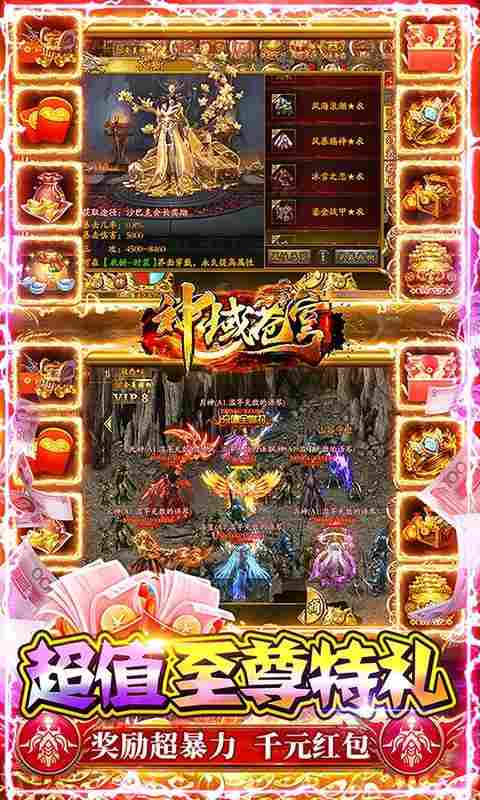 独家财神打金版本,全新地图、全新福利、全新财神打金特权,助力霸区暴爽打金!上线送万元红包+财神魂环+财神币*1W+财神打金特权!开局送10亿,花光再送300亿!全图爆真实充值,开局爆满背包红包+元宝,财神打金特权、全屏拾取特权免费送,满福利开局,刀刀爆充!财神打金,称霸沙城!