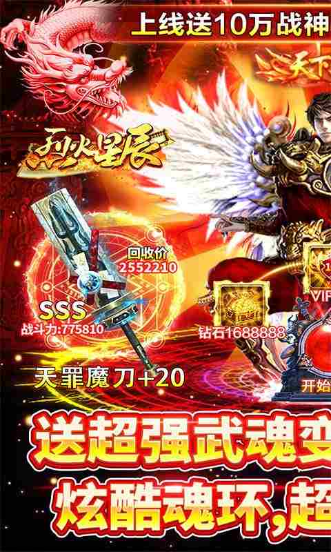 《烈火星辰(无限打金版)》上线送VIP20,送1688888钻石,666万元宝,10万战神币,福利直接狂飙,免费称号、时装任性随便送,0氪也能当爷,经典传奇再现,超强打金,可直接提现额度。炫酷魂环,超强属性加成。特色30层创世地图,大量boss等你来收割,顶级装备全靠打,无限爆充值红包,不花钱照样满神装!热血城战,多服混战,千人攻城掠地,抢占专属创世地图!