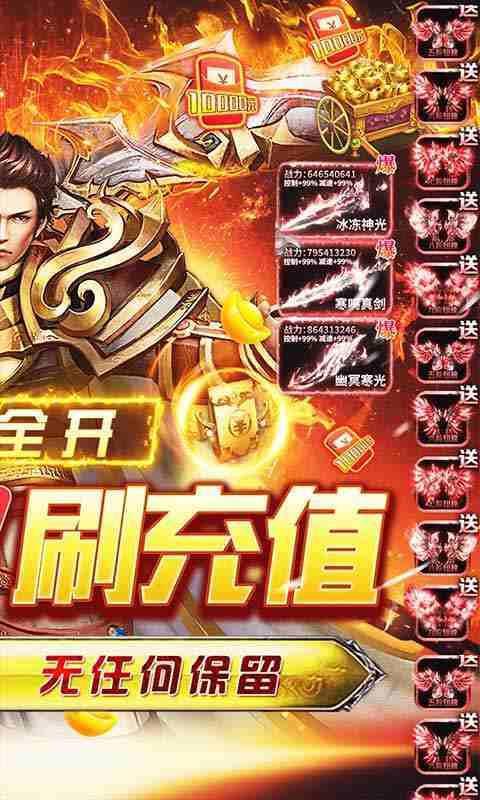 1、创角福利:上线送紫阳真气魂环、刀刀绿毒、元核星辰宝箱,开局即起飞! 2、充值比例1:10000,每笔尊享超高额外返利! 3、GM送亿万充值:每日击杀怪物8XX只,即可免费领取充值货币+海量元宝! 4、超多大陆:超多大陆,百种BOSS,千件装备,等您来战! 5、超低消费:游戏内无强制逼氪点,超低的消耗,每日白嫖一样能通关!