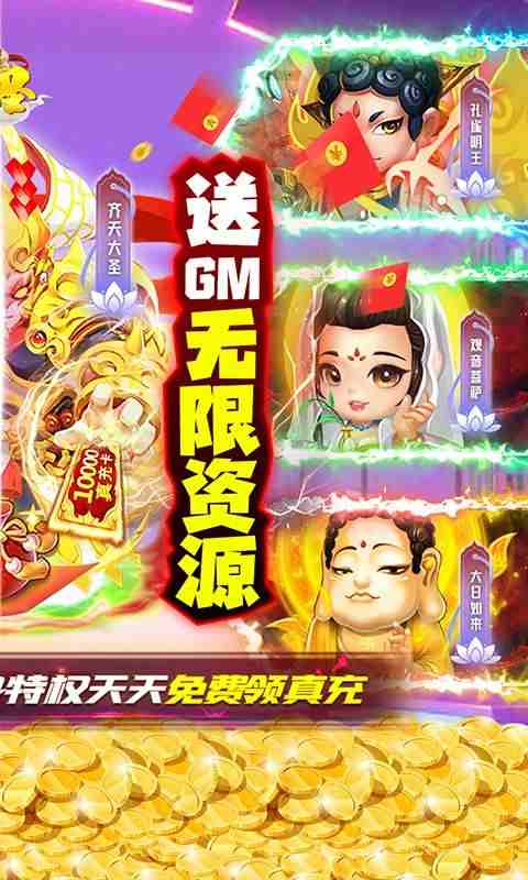 2、创角就送万元真充卡,每日在线送2000元GM充值,可免费激活首充礼包,获得强力紫金将[孙悟空]。