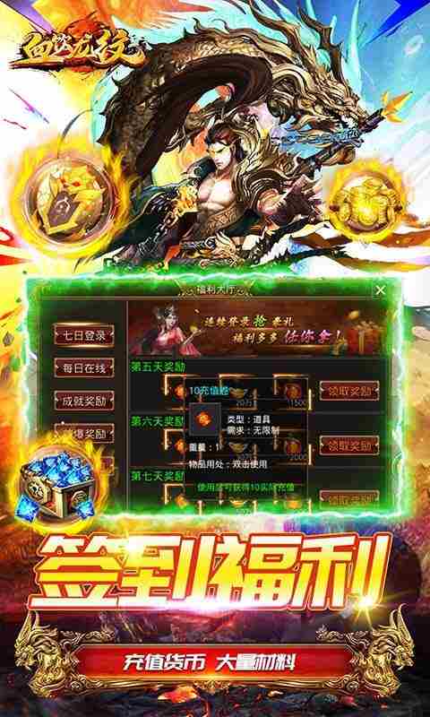 ★上线免费获得魂环,群体切割,每天签到领充值; ★超高充值比例1:10000(钻石),各种福利领不停 ★超快的打金速度,超燃的打怪特效; ★越高级的地图装备越好,不卡转生不卡等级,玩法简单!