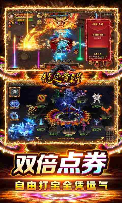 【龙之觉醒】上线送满级VIP、30W绑定蓝钻、限定称号“自创连招”、灵宠-黑白熊猫、小丑体验时装、透视特戒。独创光速双刀系统,双倍伤害,自创连招技能自由组合,争做PK王者!七天登录送豪礼,首天送战神铠甲时装,打怪可成长属性!双倍点券系统,点券可代替现金充值!自由打宝全凭运气!跨服吃鸡战场新玩法,跑毒PK,大吉大利,今晚吃鸡!