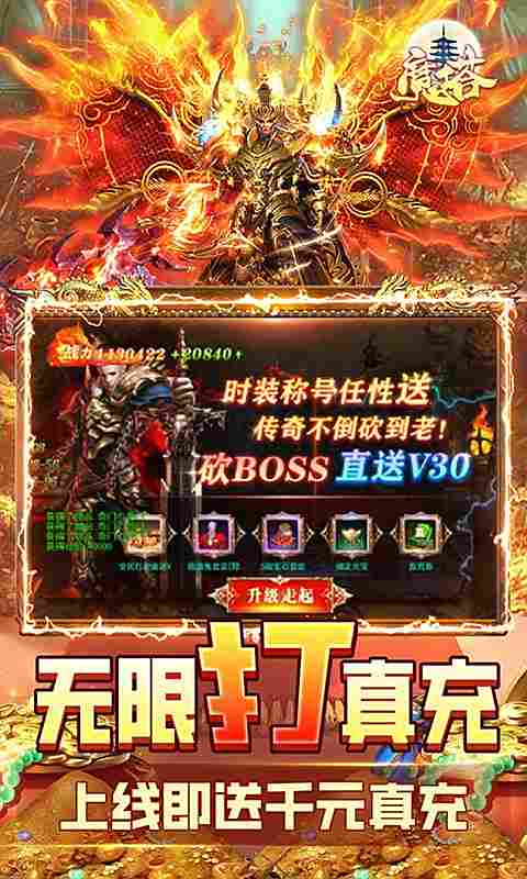 1.全民打金直送V30 2.送限时吸血鬼套装 3.5级宝石套装 4.送元宝128w 5.送直充券1000 6.送材料一大堆 7.送每日返利500元奖励领取 8.送签到/登录奖励