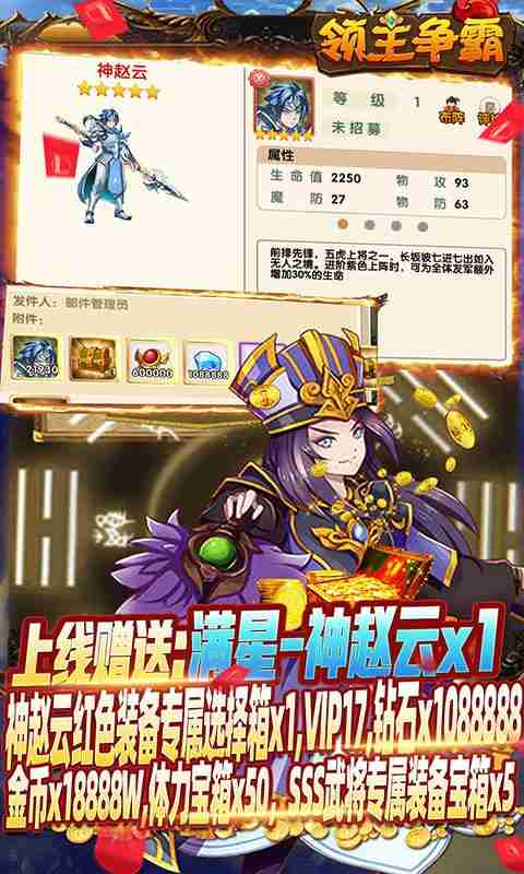 ★上线赠送:满星-神赵云*1,神赵云红色装备专属选择箱*1,VIP17,钻石*1088888,金币*18888W,体力宝箱*50,SSS武将专属装备宝箱*5