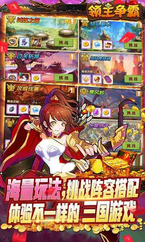 《领主争霸(送满星红将)》这里有独特的九宫格战法让你施展谋略,刘关张等多名英雄武将随你征战沙场。符文洗练、英雄专属装备、超炫合体技等多维度培养方式让你手下的武将快速成长! 收集家园材料开国建城,还有宠物上阵助您实力超群; 多重跨服争霸玩法,多种社交情缘玩法,与跨服对手的一较高下,开拓您专属的霸主之路!