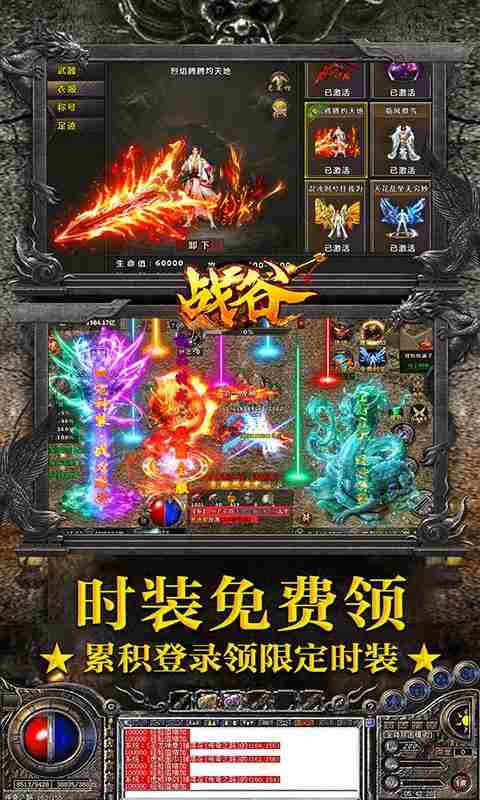 《战谷》是一款经典的复古传奇游戏,所有野外地图进入无限制,打宝刷怪全凭运气!而且超高爆率,小怪也能爆永恒!再加上独有的幸运大爆系统,超高概率获得极品装备,而且装备保值,可融合可进阶,绝对的轻松自由!