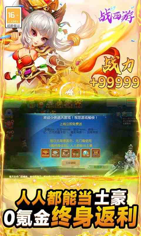 战西游福利版游戏特色<p>1.元宝*88888、银锭*88W、铜钱*一亿、万元充值卡、神兽之魂*99、至尊GM称号<br/>2.顶级至尊VIP,每天可获得至尊VIP奖励 <br/>3.宠物神宠/坐骑神宠/神器神宠礼包免费三选一<br/>4.爆充boss每天免费刷<br/>5.一键完成剧情主线任务,上线就直爽<br/>6.活跃登陆免费抽取真充卡</p>