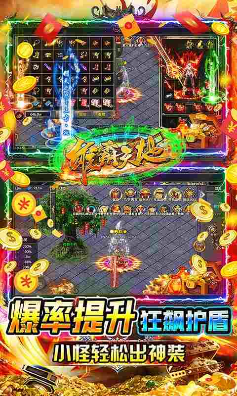 ★上线送狂飙魂环+狂飙护盾+大嫂纹耀+专属称号+全屏吸物拾取 ★独家福利一:开局攻速+100%,移速+100%! ★独家福利二:版本神技:狂飙,开启狂飙技能大幅度提升攻击! ★独家福利三:免费赠送狂暴之力! ★独家福利四:免费会员,人人满VIP! ★独家福利五:散人福利,首爆必得红包! ★独家福利六:爆率大提升,小怪轻松出神装!