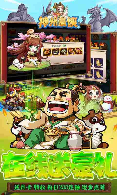 ★在线福利:在线领取三国特权、月卡、现金点、百连抽以及顶级红色武将和专属神器,每日还送200连抽
