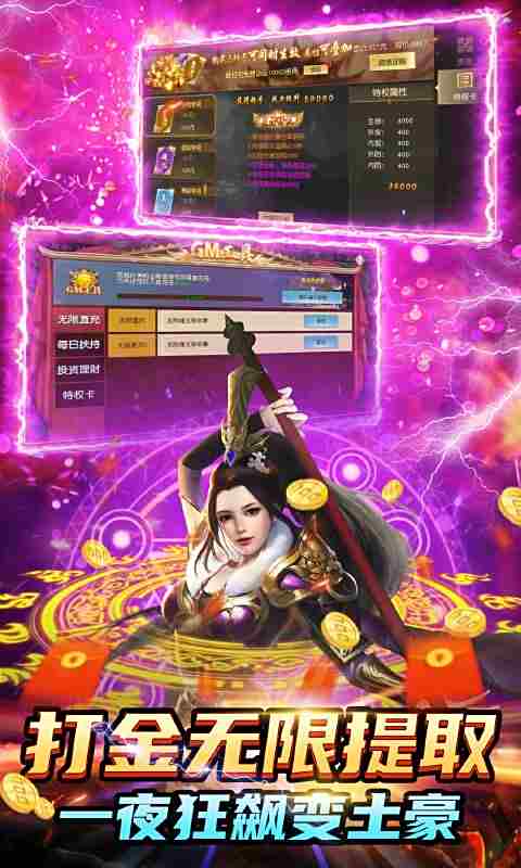 ★创角解锁GM工具直充,每日主线、副本爆直充,轻轻松松养老不逼氪 ★上线福利来袭,万元充值卡包,绝版称号,绝版幻化,战力原地暴涨 ★登录送稀有道具,签到七日每日648元充值卡,0氪到起飞 ★直充工具解锁游戏特权、投资理财,体验土豪般快乐 ★充值卡可激活游戏内累充活动,极品道具满天飞