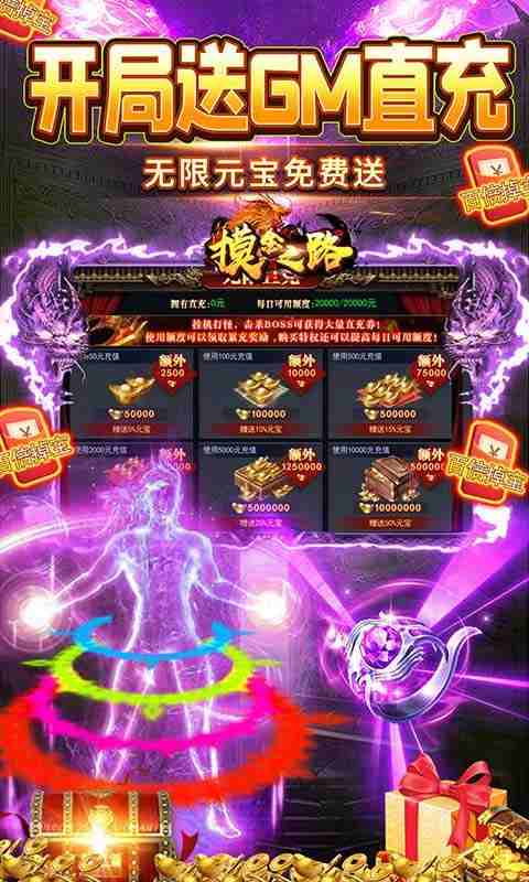 摸金之路(GM无限直充)是一款超变复古神器版本!游戏内置福利玩法无限直充,玩家可通过击杀boss或者活动获得直充币,进行游戏充值且激活所有累充活动。同时游戏内所有装备均可通过红包回收获得海量红包,装备等阶越高可兑换的红包越多!精美的画面,多人激情战斗pk,不玩套路,散人当爷,快来加入我们一起激情吧!