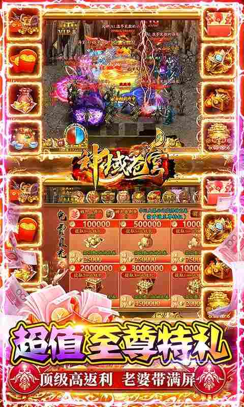 独家财神打金版本,全新地图、全新福利、全新财神打金特权,助力霸区暴爽打金!上线送万元红包+财神魂环+财神币*1W+财神打金特权!开局送10亿,花光再送300亿!全图爆真实充值,开局爆满背包红包+元宝,财神打金特权、全屏拾取特权免费送,满福利开局,刀刀爆充!财神打金,称霸沙城!