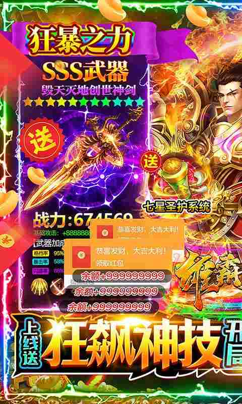全新七星狂飙版本,开局送狂飙魂环+狂飙护盾+大嫂纹耀+专属称号。还有版本神技,上线攻速+100%,移速+100%;再送狂暴之力暴爽砍怪;免费会员全部可得,人人都可升满VIP。装备首爆必得红包,与真实充值效果一致,首充、累充、赞助统统可以激活;年度超爽福利版本,全角色攻速爆率大提升,开局开砍,暴爽打金!