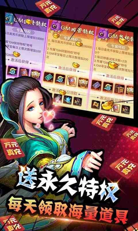 ★后缀说明:阵营抽卡,百分百出神级武将(游戏中最高等级),游戏内置GM直冲,可使用余额进行免费充值