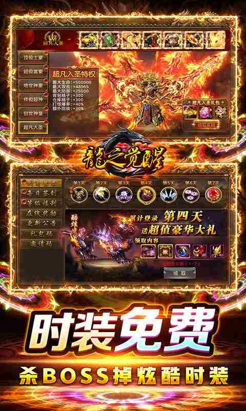 【龙之觉醒】上线送满级VIP、30W绑定蓝钻、限定称号“自创连招”、灵宠-黑白熊猫、小丑体验时装、透视特戒。独创光速双刀系统,双倍伤害,自创连招技能自由组合,争做PK王者!七天登录送豪礼,首天送战神铠甲时装,打怪可成长属性!双倍点券系统,点券可代替现金充值!自由打宝全凭运气!跨服吃鸡战场新玩法,跑毒PK,大吉大利,今晚吃鸡!