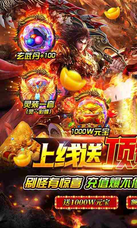 1.上线送1000W元宝、额外伤害翻倍(限时)30分钟、灵装一套(灵·彩蝶)、玄武丹*100、白虎丹*100、朱雀丹*100、青龙丹*100 2、超爽VIP特权,满级VIP全靠打,打怪即享尊贵特权 3、万元顶级赞助上线免费领,战力飙升,爆率翻倍,回收更赚钱 4、挂机也要送,在线即可领取大量福利道具,天天送红包,可抵真实充值