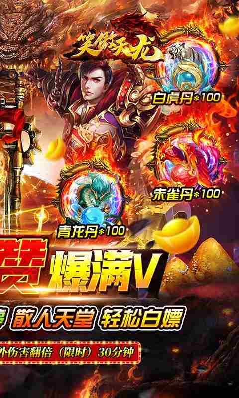 1.上线送1000W元宝、额外伤害翻倍(限时)30分钟、灵装一套(灵·彩蝶)、玄武丹*100、白虎丹*100、朱雀丹*100、青龙丹*100