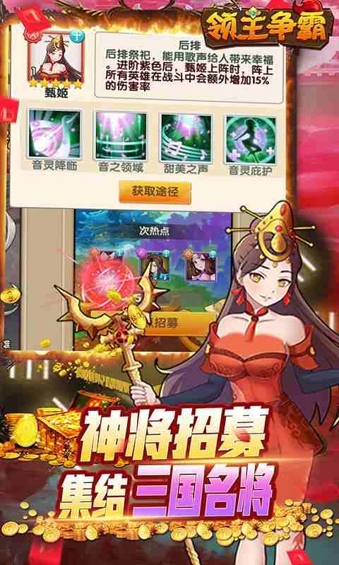 《领主争霸(送满星红将)》这里有独特的九宫格战法让你施展谋略,刘关张等多名英雄武将随你征战沙场。符文洗练、英雄专属装备、超炫合体技等多维度培养方式让你手下的武将快速成长!