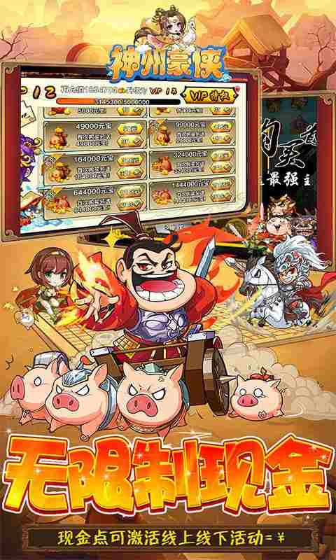★版本特色:现金点不仅能参与线上活动,还能激活线下活动!在游戏内通过副本、推图等轻松无上限获取 ★全新转盘:使用现金点抽取海量材料、红色武将等等,不充钱也能玩得起顶级阵容! ★天子特权:现金点无上限使用,还可每日领取现金点和体力丹以及充值卡 ★在线福利:在线领取三国特权、月卡、现金点、百连抽以及顶级红色武将和专属神器,每日还送200连抽 ★充值比例1:500,上线送VIP8直升卡,送称号、88888元宝、万元充值卡、武将自选箱