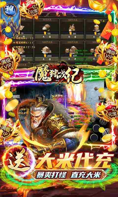 《魔狩战纪》全新大米代充,打怪获得代充券,使用可获得大米,真正的散人福利版本,还有全新特色魂环系统,魂环加成称霸三国!登录送代充魂环,完成任务送满级VIP,送无限点券,点券可兑换首充、自动回收、自动分解,超爽百倍爆率,万物皆可爆,满屏光柱,爆啥都是米!精英必爆点券!BOSS必掉大米!充值全靠爆!,一秒5刀,刀刀切割,砍怪如切菜,主线送关云长时装,三国传奇乱世等你来战!