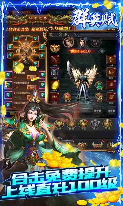 《群英赋OL(冰雪湮灭刷金)》是以复古传奇冰雪三职业职业版本端游为基础,倾力打造的传奇手游。为了打造原汁原味的传奇手游,手机版将传承端游的经典设置,除了打怪掉宝外,自由PK、行会争霸以及沙巴克攻城等传奇经典元素都将在手游中呈现!同时,游戏还注重操作手感,再加上精美又极具传奇风格的画面,游戏上线即赠送巨额红包供玩家成长途中花销,每日打boss刷金必得真充红包碎片,力求为玩家打造指尖上真实震撼的战斗体验!