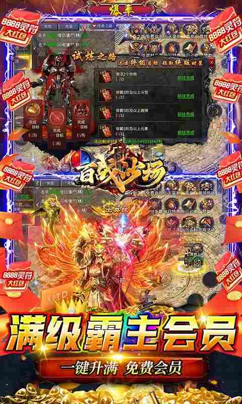 《百战沙场》超爽武侠传奇,开局一键满级会员直达霸主!再送狂暴之力免费激活,还有百万年魂环、8888灵符大红包以及专属狂飙神技,光速砍怪,暴爽开局;免费领取白给礼包还有宠物熊猫,助力狂飙!还有命格解锁,超强属性三选一,你想怎样就怎么样;完成试炼之路还有红包免费得,装备首爆灵符红包都有!0氪白嫖轻松霸服!