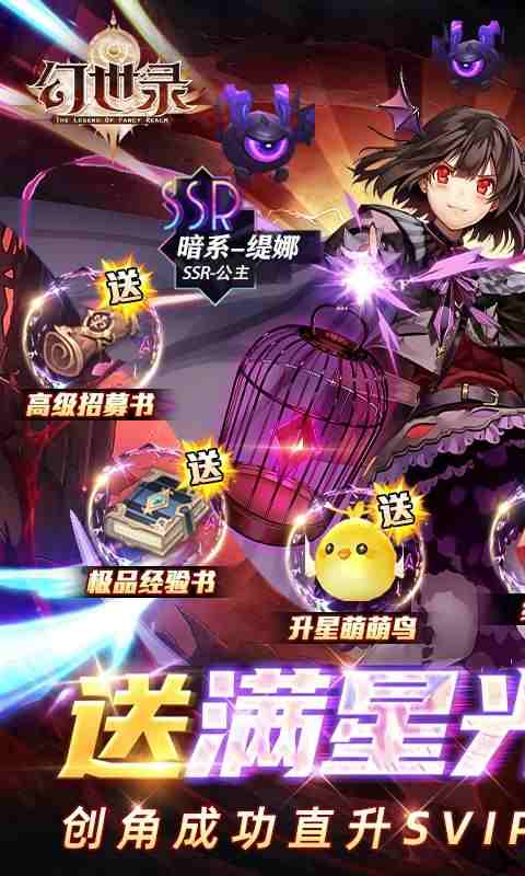 1、登录送SVIP5,充值比例:1:2000,超强群体输出卡,百次抽卡、强力符文和海量红水晶 2、免费领取周月卡,充值奖励直接免费领 3、万抽转盘基础资源海量道具等你拿,还有最终大奖暗系SSR暗圣邪龙免费领取 4、在线领充值,万元真实充值卡,海量红水晶随便拿 5、战斗加速,飞速战斗,帮你极速成长 6、15级免费领取强力SSR无名神