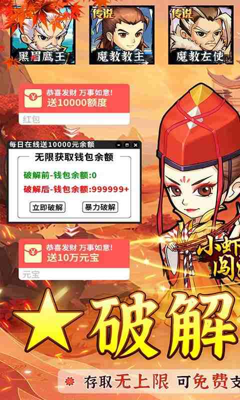 免费直充,每日均可无限获取钱包余额,存取无上限,能激活运营活动 2、招募侠客全靠招募NPC,遇一个招一个赚一个,不吃同名卡 3、闯关送1000连抽,闯江湖必备 4、送无限刷新卷,每天送300元余额卡,从此不惧怕江湖险恶 5、初入江湖,送成长基金,海量返还元宝 6、虾米成长,送旷世绝学,从天而降的掌法 7、大侠之路,送无限传送,无限TP 8、武林传奇,天下武功唯快不破,移动速度300%提速