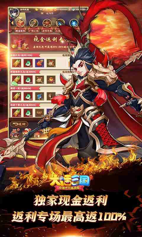 满V开局、三国武将自选、18万元宝、千万铜钱,让你赢在起跑线;疯狂十连,带你组建神将天团;现金福利功能每天免费领现金券,代替RMB免费充值和购买礼包,一朝暴富不是说说而已!