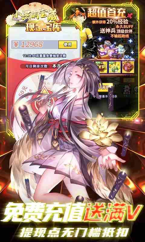 上线就送10亿钻石,登录在线还可抽取点,礼包直充买不停,不花钱也成神!打金永无止境,忍者手游巨作《小黑的宝藏(百亿钻石提款机)》强势来袭,超清画质,特色系统,多样玩法,海量装备给你前所未有的刺激体验。击杀BOSS以及挂机无限掉直充卡,0氪畅玩不是梦!创角直升满V,天天送真充,直充特权免费拿!免费首充即送炫酷时装和超强BUFF,史诗装备等!还有全新活动,新增各种神级伙伴等着你!!