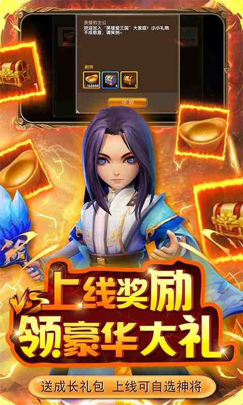 上线福利:送VIP18、168888元宝、100万铜币、S武将选择箱2*4、成长礼包*1