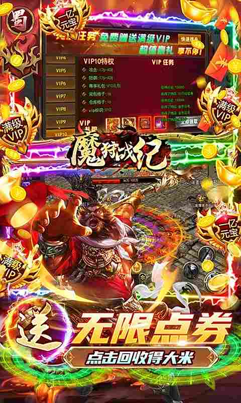 《魔狩战纪》全新大米代充,打怪获得代充券,使用可获得大米,真正的散人福利版本,还有全新特色魂环系统,魂环加成称霸三国!登录送代充魂环,完成任务送满级VIP,送无限点券,点券可兑换首充、自动回收、自动分解,超爽百倍爆率,万物皆可爆,满屏光柱,爆啥都是米!精英必爆点券!BOSS必掉大米!充值全靠爆!,一秒5刀,刀刀切割,砍怪如切菜,主线送关云长时装,三国传奇乱世等你来战!