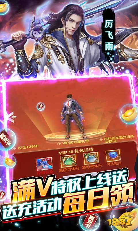 1.上线打开背包即领满VIP、88888元宝,战力大礼包,成长大礼包,100元真充卡*1 2.全新每日送充活动,天天免费领取充值卡,真充结晶和无门槛真充卡。 3.次日登陆免费领取绝版千万战力如意豪华礼包。 4.累计登陆三天可以免费领取绝版百万元宝招财仙猫豪华礼包。 5.全新修仙祝福活动,高达6倍真充卡返利的豪华大礼包仅限开服首日有售。 6.月卡打包优化折扣打折全买,一键尊享所有奖励,特权,助力称霸仙界。 7.购买百倍投资,无论是登陆,闯关,升级,都可领取多倍元宝道具返利。 8.仙尊卡购买即可获得永久时装和新版特权,购买2次便可永久激活仙尊特权。