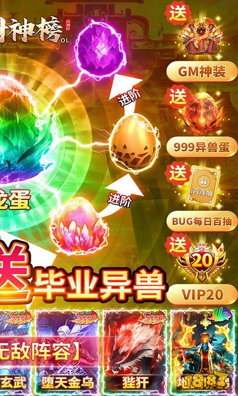 1、上线送VIP20、元宝*888888、超级礼包,绝版称号、上线就起飞! 2、立送高级百连抽,超强SSSR异兽拿到手软,七天更送一套无敌阵容! 3、无限资源免费送,毕业异兽免费领! 4、升级送十万红包、GM神装在线领! 5、月卡终身卡基金连登送,挂机无限刷真充!