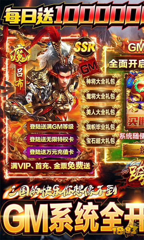 1、上线福利:充值比例1:10000!上线送满VIP、满GM、超值首充、万元充值卡、无限银两激活卡、金票、毕业礼券、海量资源 2、在线赠送:在线就送传奇特权卡、星耀特权卡、绝版称号、周卡、月卡 3、登录即送:每日登录就送百万元宝、百次抽奖,每日签到领取无限现金券 4、首氪成神:首充宝箱累计可领3天豪礼,神将孙策、红色军事郭嘉、金牌辅助大乔还有大量材料,助你升级快人一步 5、毕业商城:新增买断商城,一次付费,直接毕业,所有武将一应俱全 6、乐于助人:提升赞助等级,赞助福利多重豪礼免费拿,幸运云购更可使用金券购买,赞助等级越高可购买次数越多