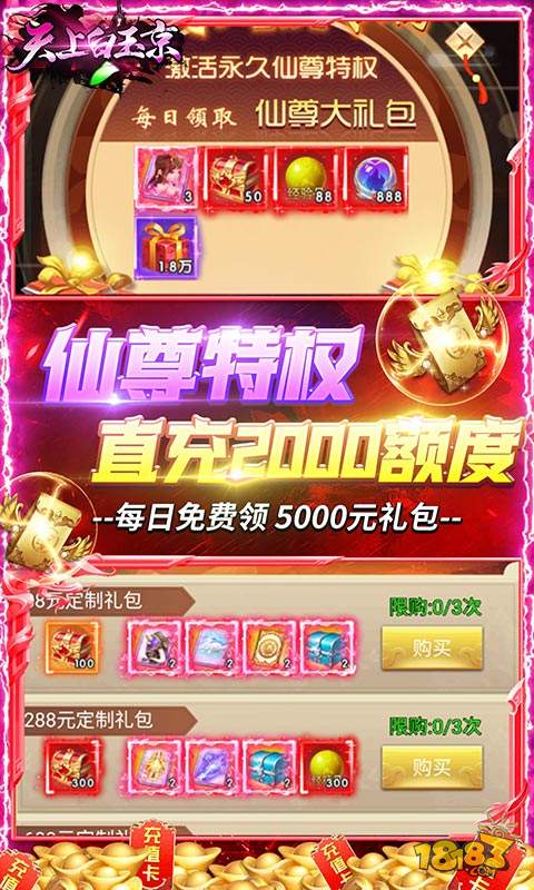 1.免费点充:开局送点充特权,手速越快,金额越高,无限648元点到手软! 2.GM工具:开局送直购币*8888,至尊称号,超值礼包,GM装备全部免费破解! 3.直升260:送直升260级经验丹,送100倍真充,直购币*5000,传奇属性丹·三阶*15000! 4.永久保送:每日免费1000元直充额度,额度充值激活所有累充,激活线下元宝返利! 5.开局壕送:SVIP10,月卡*1,20阶坐骑羽翼礼包,元宝*888888,神兽-神·天狼星*1,铜钱1亿! 6.全新特权:仙尊专属特效称号,提升2000元直充额度,每日免费领取5000元特权专属礼包!