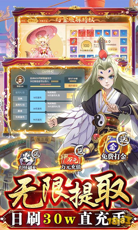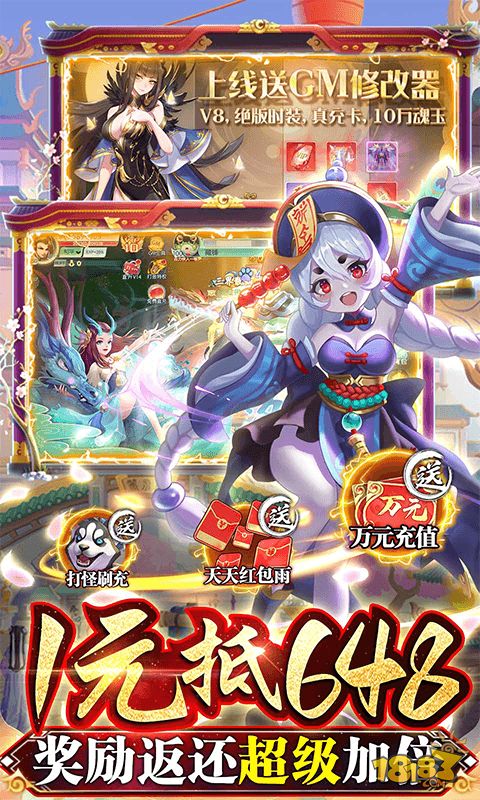 ★上线送VIP10、10w魂玉、10w绑玉、100元充值卡、20000直充币、时装:雀之魂 ★全民打金刷充,GM修改器余额提取无上限 ★GM商城海量商品1魂玉购买 ★升级就送万元充值,活跃、挂机送充值盲盒 ★1元可得648元红包,海量超值礼包等你拿 ★充值比例1:1000