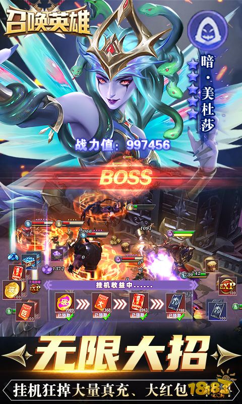 1、创角即送:守护10级、钻石888800、提款余额200元、50抽高级招募券、万元真充卡大礼包; 2、全新代码破解器:包含破解充值、货币提现、破解礼包、成长基金、特权卡等等;闯关即可免费提升破解额度; 3、首抽即获得SS英雄梅露西娜,后排瞬移突进,击杀无限满怒大招,95%超高闪避; 4、七天登录送不死族超强SSS黑袍,大招百分比削减目标生命上限,另有百分比吸血无限回复,助力爬塔闯关获取大量连抽; 5、充值比例1:2000,首充十倍钻石,续充永久4倍钻石(游戏仅一种货币); 6、独创无氪金守护VIP,每日登录即可获取升级经验,连续登录经验获取还会增加,每周任务还能额外获得大量经验; 7、挂机狂掉落各种大红包,使用可获得大量真充、材料等; 8、送无限抽:完成精灵的指引即可获得无限连抽宝箱,每日都可获得高级连抽; 9、无限充值转盘:每日登录即可获得抽奖次数,海量真充等你来拿; 10、完成精灵的目标可领取海量材料、更有各种SS、SSS5星英雄等你来选; 11、升级可领海量钻石、高级召唤券以及守护经验免费提升守护等级;