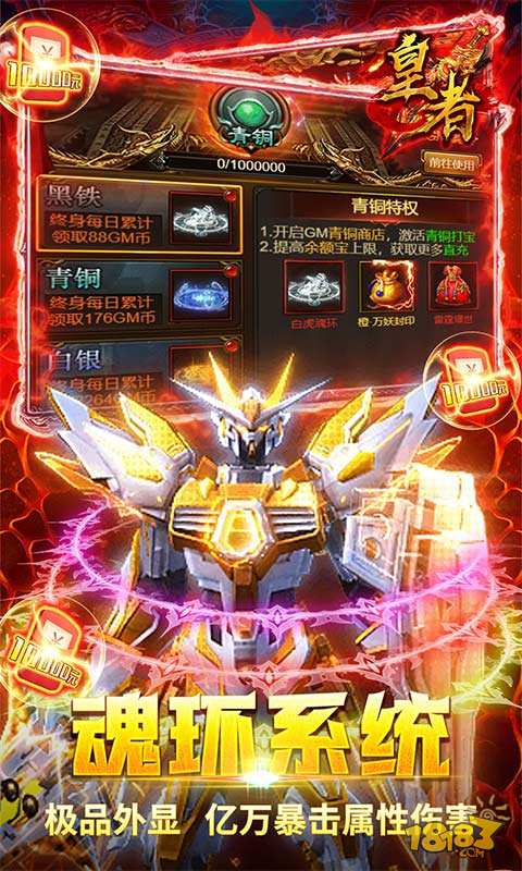 1、上线送100万元宝、免费激活科技工具,送青铜GM特权,领取白虎魂环! 2、新增极限外观魂环系统,助力全系统属性爆炸扩展!瞬间亿万伤害输出! 3、新增特色玩法系统战法道星海跨服战场、十二星座特色系统装备,更有全新活动万重山助你登顶! 4、每日签到在线无限送真充卡,无敌资源百倍返,纯纯的福利游戏! 5、充值比例1:10000,首冲10元,十倍返利真充卡,新增商城一次买断至尊雷霆装备!