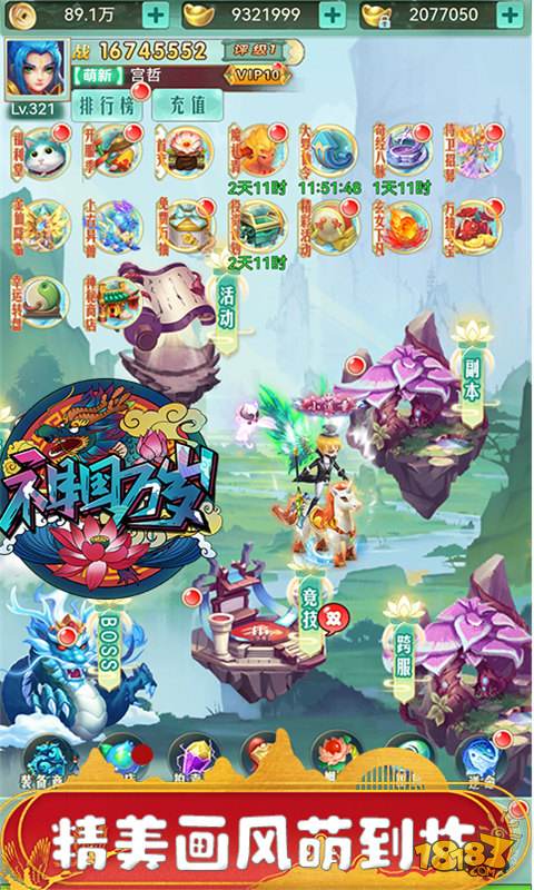 注:充值比例1:1000,首充双倍。上线送100000元宝、100万绑元,500万金币。 新版大礼: 【第1重】:新开发免费万抽功能,只要你够勤快,靠抽奖就能不愁吃喝。 【第2重】:游戏角色多样,玄幻人物、封神神话,三国豪杰,能满足你各种口味! 【第3重】:超值折扣店,3折起售,超值钜惠! 【第4重】:人多力量大,全民充值领取豪华大礼包! 【第5重】:登录2天送时装,3天送橙卡,4天送称号,7天送神兵!