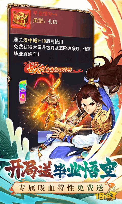1、开局送毕业悟空,专属吸血特性免费送 2、闯关直送万无套路真充,激活线上活动 3、开局无限资源,宠物包毕业 4、无限抓鬼练宠,战力疯狂up!up!up!