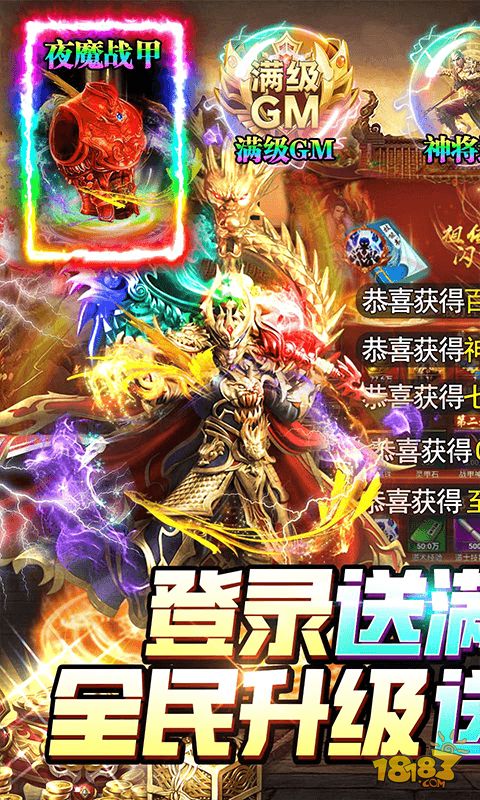 ★上线送GM1、100w元宝、100w绑元、红色神将地藏 ★登录免费送满级GM9 ★GM商城商品全部1元宝购买,GM福利活动免费领取海量奖励 ★升级送百万代币 ★打怪爆真充,海量活动免费激活 ★1元可拿648元 ★充值比例1:5000