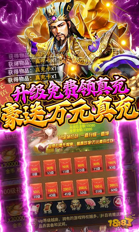 1,无限送真充:每日活跃任务免费送真充卡,可激活线上充值活动! 2,暴揍策划:看策划不爽直接暴揍策划给金币,最高可获得50倍金币奖励! 3,上线福利:免费送vip15,2888888银币,28888金币,开局直接起飞! 4,福利转盘:签到送累计一万次次数,白给的抽奖次数赶快来玩! 5,万元红包:来玩升级就送万元真充卡,一直玩一直爽,可激活线上充值活动 6,闯关送真充:每通关一个势力即可领取真充卡,一直闯关一直领,真充卡直接白给了