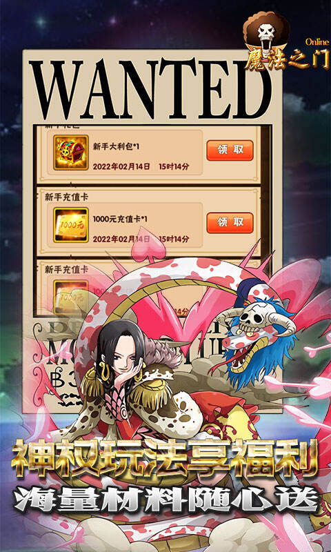 1、上线送至尊V、千万钻石、千万贝利,登录就送千元真充卡与新手代币礼包。 2、GM神权福利多多,一经激活每日领取超值豪礼与超V代币,资源拿到手软。 3、至尊代币可免费兑换无限资源、GM商城、专属定购等活动充值激活卡,0氪也能玩到爽。 4、无限资源活动一经激活,每日无限领取资源,专属定购活动激活后可随心搭配领取道具。 5、钻石、至尊基金系统,一经激活,每日可领超值资源豪礼。