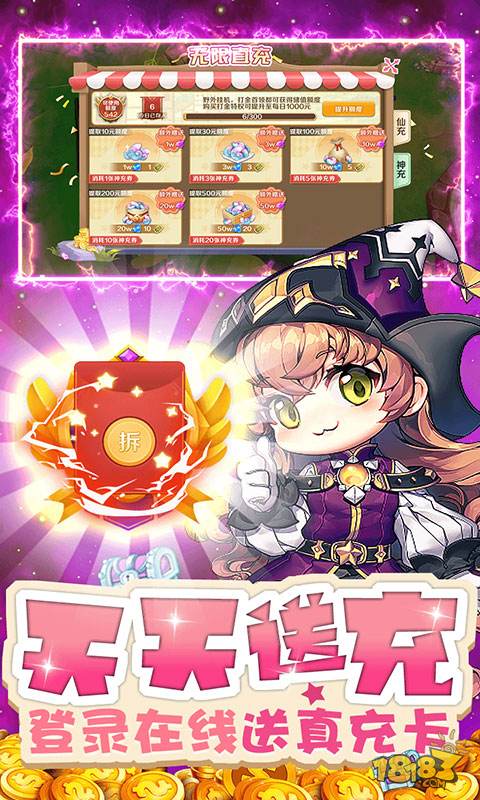 上线送VIP16、10万紫钻、时装·闪亮登场、称号:无限打金、98元充值卡*1 1级开启无限直充福利,白漂解锁全VIP特权 七天登录送千元真充卡,海量材料领不停 超值月卡福利拉满,解锁提升无限充值额度 首充礼包超值放送,极品装备超级黑龙三天领 签到送神器、坐骑、时装幻化、各种材料,登录即可领取,战力直线猛飙升