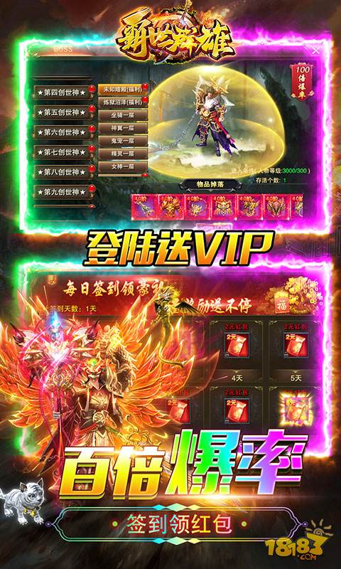 ★上线即赠 钻石*50000、元宝*1亿、战神币*10万 ★首充任意金额,送绝品神兵武器,高阶装备,千万元宝 ★每日签到领豪礼,海量红包送不停 ★上线免费送vip,更有极品大礼包免费领取 ★游戏一键离线托管,让你挂机无忧 ★冲级领大奖,无限豪礼等你来拿 ★每日限购礼包 超值返利,免费领取