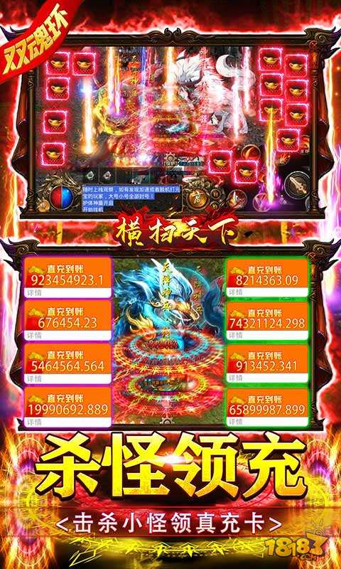 横扫天下(双魂环超变)携双魂环系统,全屏吸怪、群体切割革新上线! 开局送终极神器,全套终极技能,全民免费送自动回收、自动拾取、刀刀绿毒! 唯一独创魂环、身环双系统,独家永久狂暴机制,打怪直接领真充卡,激活所有活动,散人真正白手起步! 革新推出全屏吸怪、群体切割技能,魂环全免、攻速全满,满地装备刀刀爆,装备全靠爆,最爽的双魂环全新传奇邀您零充体验!