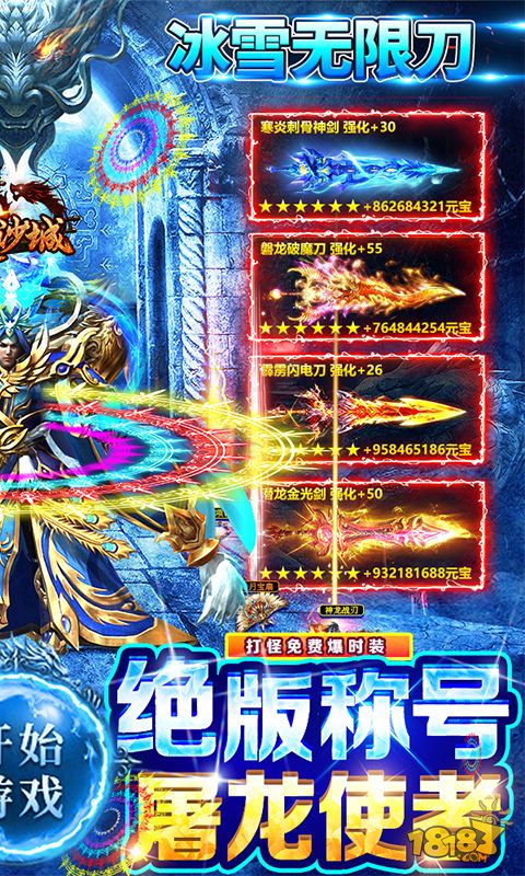 【屠龙决战沙城】上线送满V,海量大米,极品幻武,绝版称号,百年魂环,开局满攻速,真无限刀,所有地图无限制,想进就进,特色狂暴系统,打怪爆率秒升100%,满屏光柱,装备全靠打,小怪爆终极,游戏内所有装备保值,高阶神装回收、进阶、融合、交易,全自由支配,特色时装boss,各种炫酷时装幻武免费爆,特色沙捐提升永久爆率,圣器系统,珍稀属性免费升级,永久加成,鸡王争霸谁与争锋